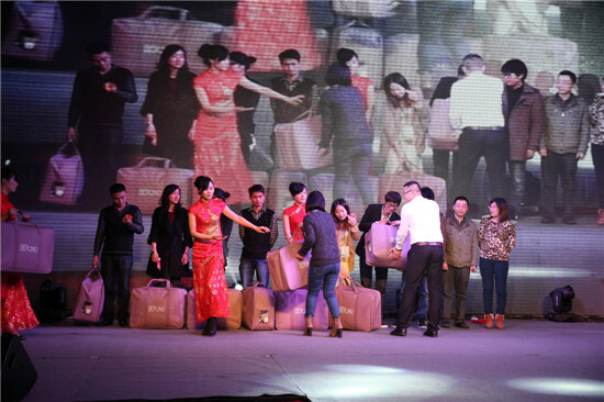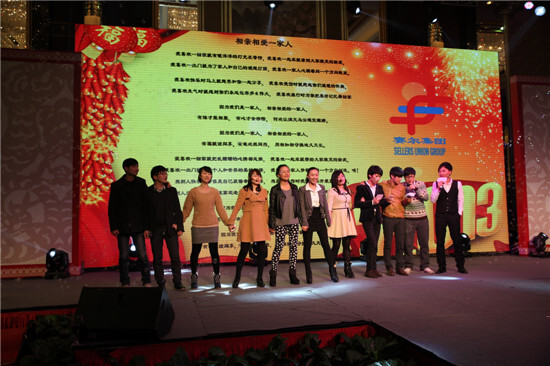 2月23日晚18:30,集團2012-2013度“我們是一家人”主題大型聯歡晚會在高貴典雅的T臺Fashion秀中拉開序幕。集團全體董事及600多名員工參加晚會。晚會由晚宴、節目表演、幸運抽獎、節目評比等環節組成。晚會主持人由集團行政人事部胡靜靜、賽爾國貿吳錫東、優景進出口付潔、優勝國貿王淑樂四人擔任。