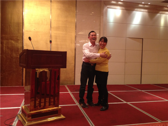 在大家的起哄下,殷書記與同在賽爾工作的妻子在臺上熱情相擁