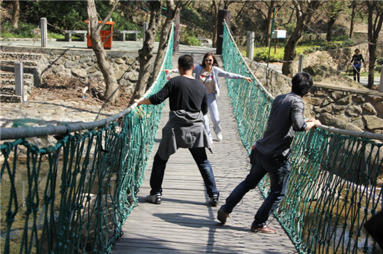 走在搖晃搖晃的懸浮木橋上,本就心驚膽戰,更何況還有兩個大力士作怪。可憐的小吳,也就只能盡力伸展雙手以求平衡了,哈哈~
