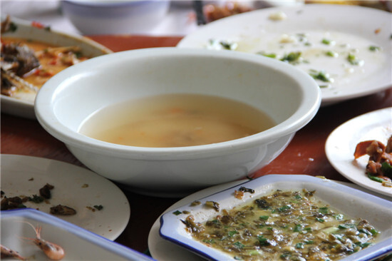 中午,我們來到半山腰上的青松山莊,品嘗了五龍潭特有的野味,溪坑魚,兔子肉,馬蘭頭等。大家風卷殘云,不一會兒盤子就都見了底,徹徹底底地踐行了一把光盤行動