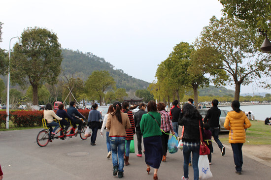 早上8點30分,迎著初晨的朝陽,伴著和煦的春風,大部隊在體育館門口集合后出發(fā)。大家熱情洋溢,一路上歡聲笑語,很快,我們就來到了目的地——東錢湖小普陀區(qū)。