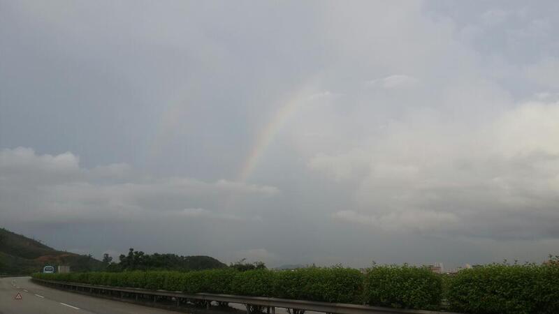 出發(fā)了,高速路上堵車堵了11個(gè)小時(shí),下完大暴雨,又餓又累,大家都下車觀看雙彩虹,可謂苦中作樂(lè)啊。