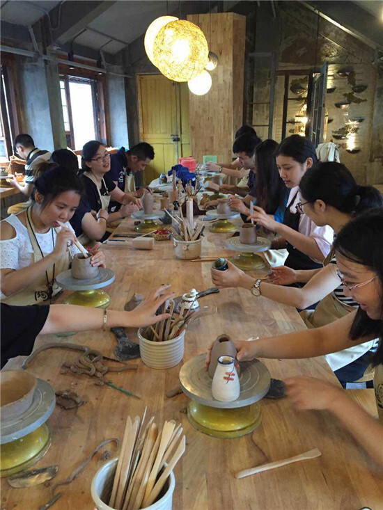 一邊在游覽,另一邊的寧波講師們已到達南塘老街手工陶藝體驗館——陶一天。進館以后,大伙系上圍兜,拿起工具,大展身手,一個個簡直就是藝術(shù)家附體,美美地創(chuàng)作著自己所愛的各式花瓶。
