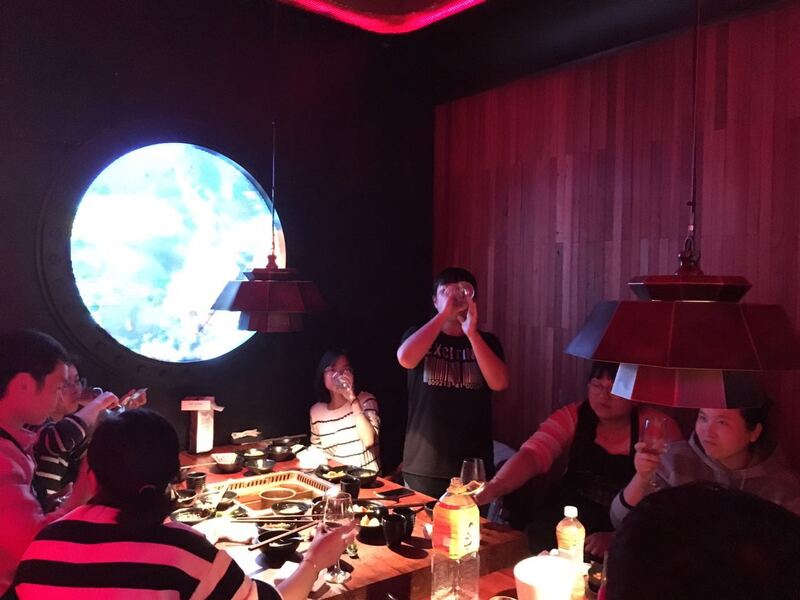 ACTION:大渝火鍋店瘋狂涮鍋,邊涮邊分享菜色,“肉我們有”“蝦滑分你們一半”……是的,以肉會友。酒過三巡,菜過五味,跳過領導講話,跳過新老人發言,直接灌張總。不肯喝?不許!咪一口?再灌!中場休息認個親,你認“兒子”,他找“孫子”,我分“房子”,演了一出精彩絕倫的家庭倫理劇。緊接著,繼續灌張總。還扭捏?喝湯底~(在這不得不批評一下張總,你說你一東北大老爺們,那天怎么就這么扭捏?)繼續干湯底,計時干湯底。酒足飯飽,新老人發言,再灌張總,輪流拿湯底灌張總,最后,大家都愛上湯底……