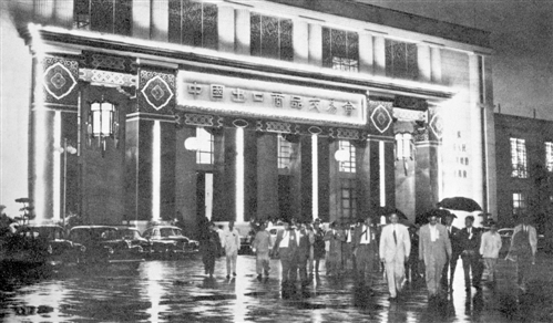 1957年10月,在廣東省廣州市中蘇友好大廈舉行的第2屆廣交會展館夜景。 (資料圖片)