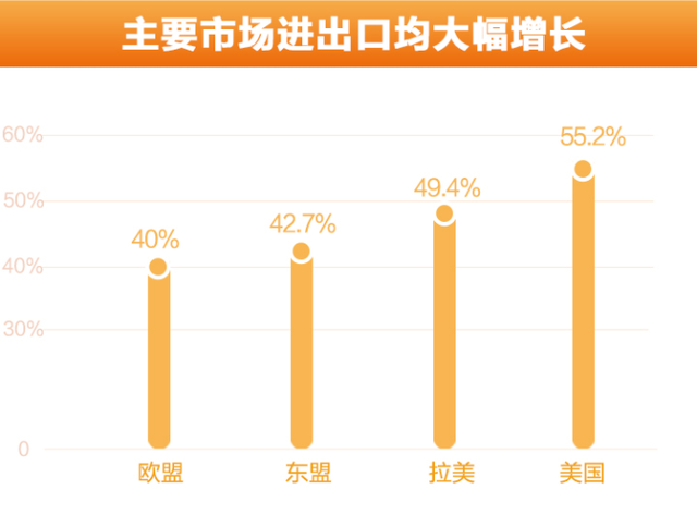 從主要市場來看,浙江對主要市場出口、進口均實現(xiàn)大幅增長,歐美對浙江出口拉動作用較大。對歐盟、美國、東盟、拉美出口分別增長40.0%、55.2%、42.7%、49.4%,分別拉動全省出口增長7.5、8.8、4.9、4.4個百分點。自東盟、拉美、美國分別進口438.4、270.8、160.2億元,增長32.3%、74.6%、1.4倍,拉動全省進口增長5.7、6.2、5.0個百分點。