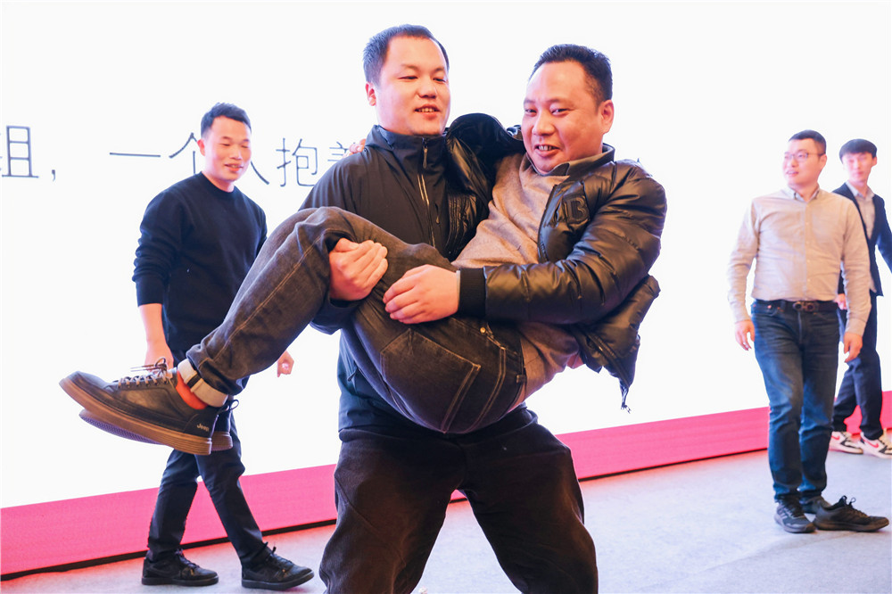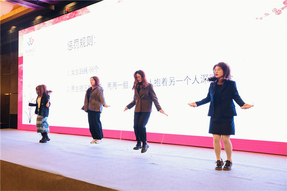 回首2023,各部門也有未完成的業績指標。而獎罰分明,方能激發干勁。會議上,我們也針對未完成業務指標的部門領導,設定了小小的懲罰。我們的懲罰分為女生部分和男生部分。女生的懲罰是跳繩66個;男生的懲罰是兩兩一組,在指壓板上進行深蹲,要求一人抱著另一個人深蹲5個。懲罰的游戲環節讓原本稍有嚴肅的會議氣氛瞬間變得輕松而歡快起來。瞧,那指壓板上顫抖的雙腿和吃力的表情包瞬間吸引了大家的眼球,讓我們猜猜是哪位領導的表情又會被部門成員做成新的表情包呢?