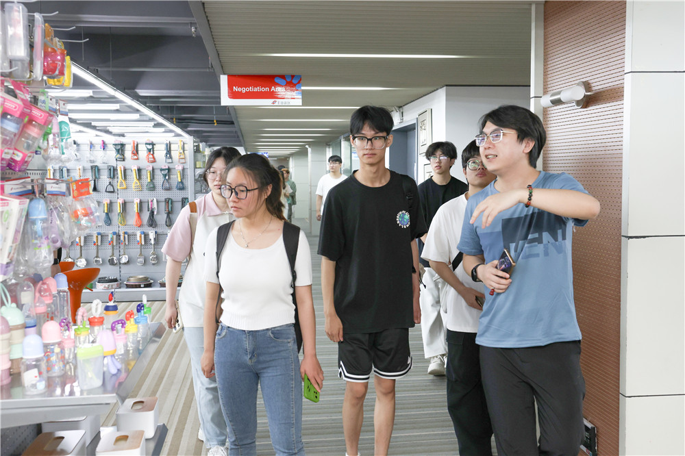 短暫休息片刻后出發世界最大的小商品城——義烏國際商貿城,集團帶領同學和老師們主要參觀了商貿城一區和二區。在逛店鋪的同時,講解人深入介紹了各產品的主要出口國、各國客人對產品的喜愛偏好等。現場還針對現場同學們關于出口貨物體積計算單位等方面的疑問一一解答,讓同學們零距離感知外貿工作氛圍。