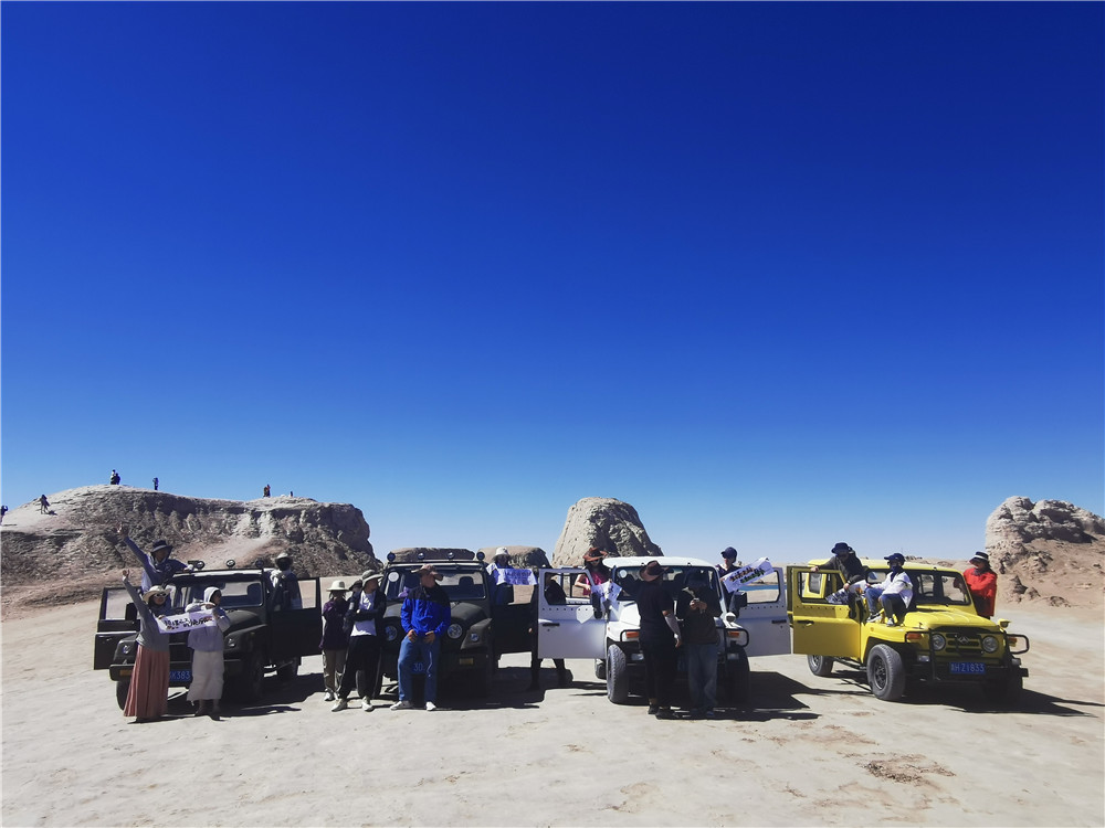沿著315國道,第二站是獨一無二的水上雅丹。在這里,大家五人一組,進行了一場緊張刺激的越野賽。穿梭在戈壁與湖泊之間,顛簸崎嶇的小路也阻擋不了小伙伴們激動的心情。在你追我趕中,不僅看到了雅丹風景之美,在聊天打趣中,也讓大家彼此之間有了更深的了解。