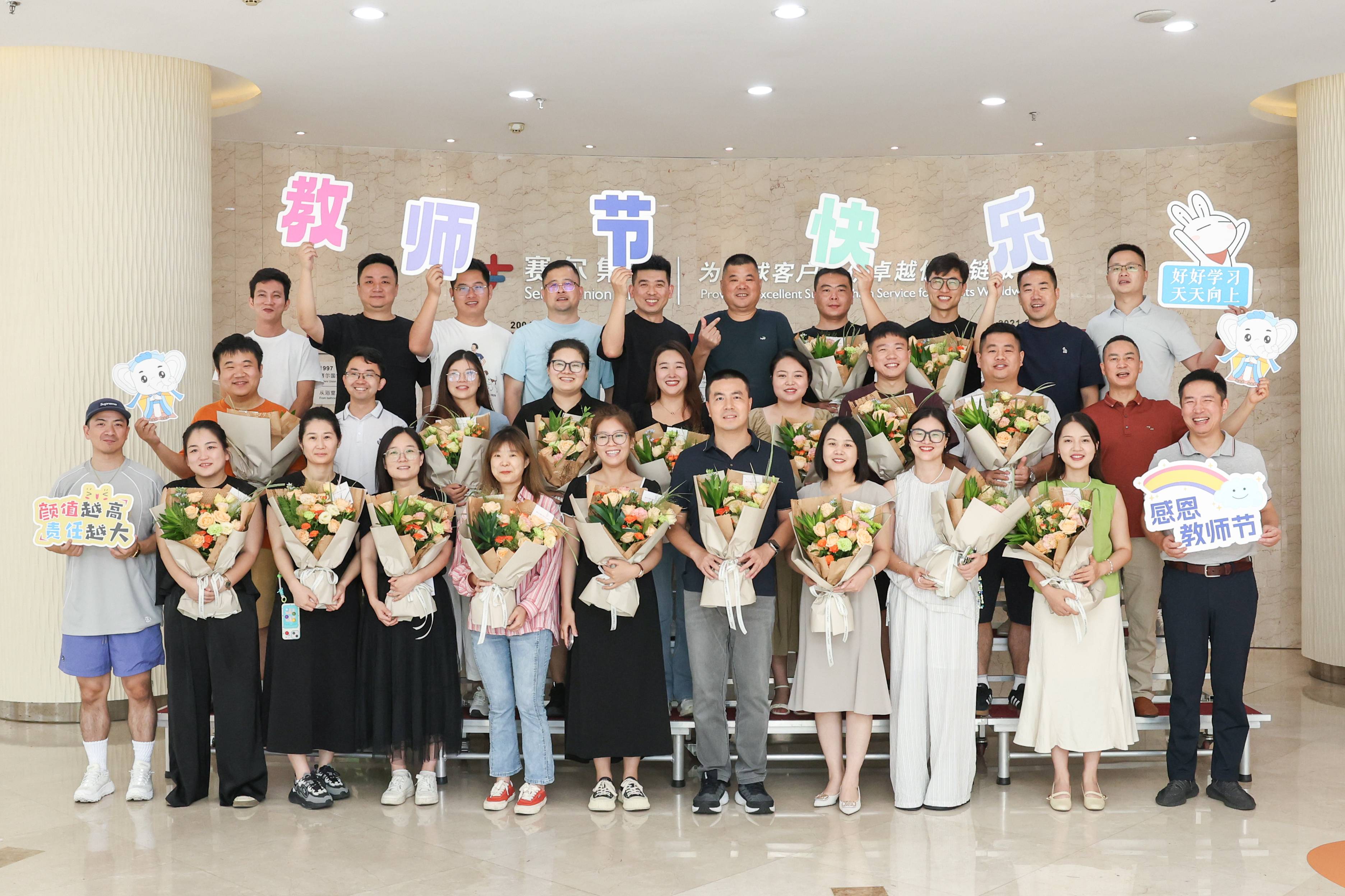 在全國第40個教師節來臨之際,賽爾學院為集團191名內部講師精心準備了節日禮物,同時精心挑選中式款花束贈予講師,向講師們致以最崇高的敬意。活動現場,特別設計的孔子形象的IP小象,生動活潑地展現了講師們在賽爾課堂中盡己所能、傾囊相授的高尚風范。此次活動將傳統元素與現代創意巧妙融合,不僅是對講師們卓越貢獻的認可和感激,更是對千年師道精神的傳承與弘揚。活動尾聲,講師們歡聚一堂,合影留念,定格下了2024年教師節的喜悅與溫馨。