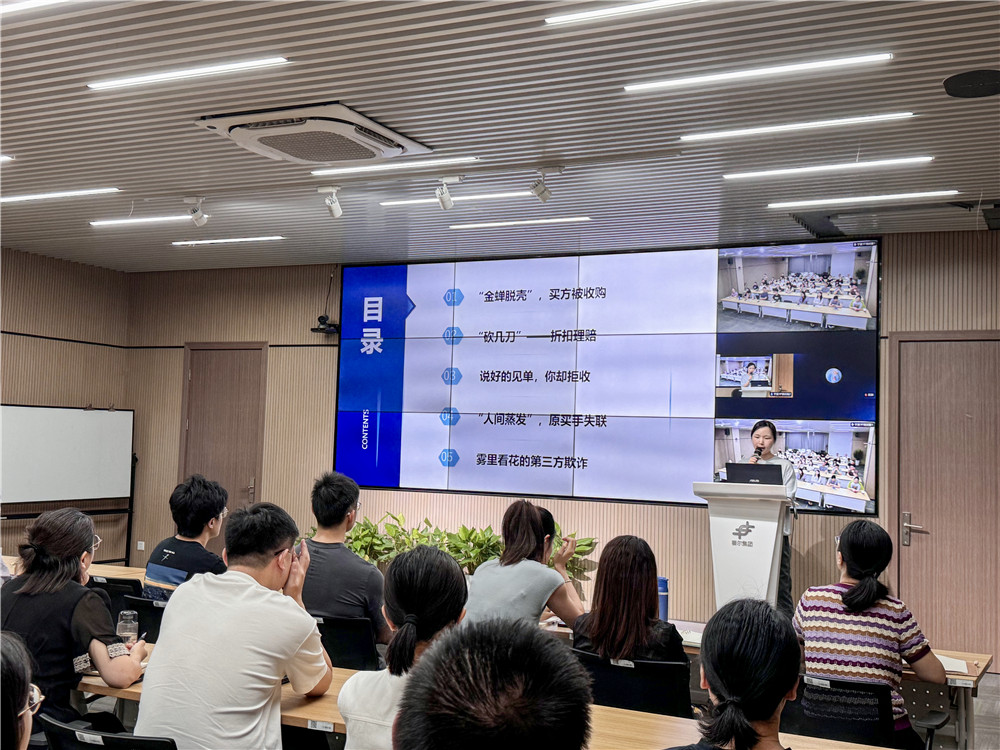 會議第一部分介紹2025年上半年集團的信保案件情況及出險國家分布,隨后聚焦收購、折扣、拒收、失聯、欺詐五大典型風險場景進行客觀闡述。風控審計部以真實案件為出發點,緊扣關鍵要點,講解內容兼顧實用性與趣味性,寓教于樂。第二部分為法務案例分享,精選集團內關于出運前后的質量問題、第三方糾紛及延期交貨糾紛的案例,立足爭議焦點,以法律的專業眼光直擊痛難點,干貨滿滿。分享會最后的小彩蛋是法務小課堂宣導片。